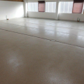 Fußbodenerneuerung während des Betriebes Hälfte/Hälfte mit lösungsmittelfreien und geruchsneutralen Epoxid.